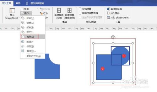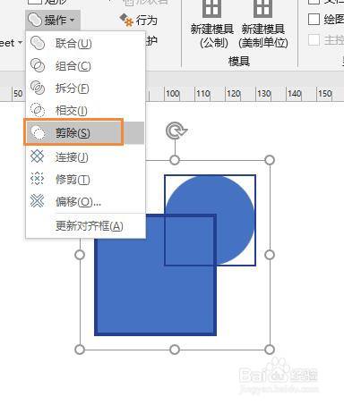 点击【操作】,下拉列表中点击“剪除”。操作完成后效果如图,在正方形上剪除了圆形和正方形重叠的部分。