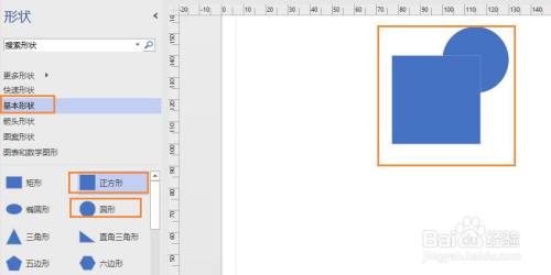 从左侧形状窗格中选择任意形状拖动到绘图页面中,如图中所示,两个形状之间有一部分重叠。全部选中,复制一份一样的图形。