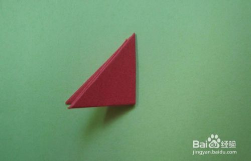 然后,把折好的红色彩纸左边向右边对折为三角形,并压平整,这样一个三角插就做好了,如下图所示。