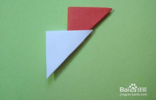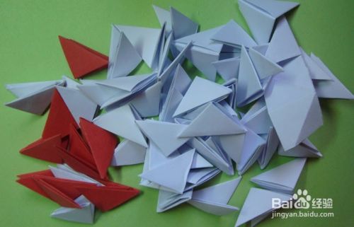 然后,取几张白纸和红纸折出很多三角插。白色的三角插折的要比红色三角插多些,这是基础的拼装构件,如下图所示。