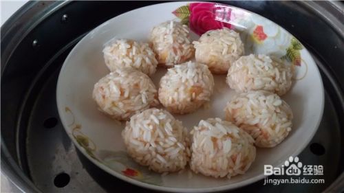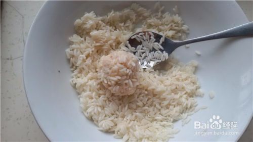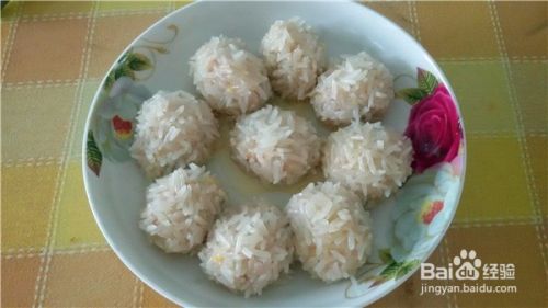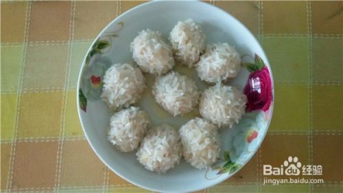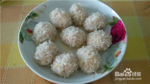把肉馅挤成圆子,也可以用勺子团成圆子,再裹上一层糯米。