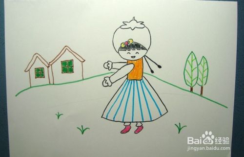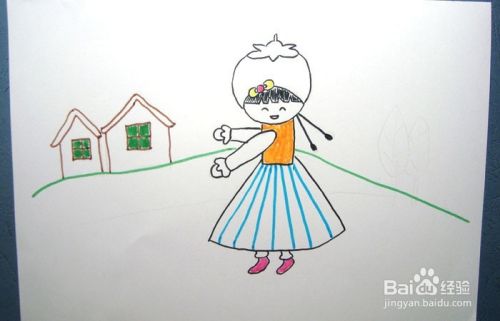 然后,用橙色和蓝色彩色笔给小女孩的衣服和裙子涂上颜色,如下图所示。