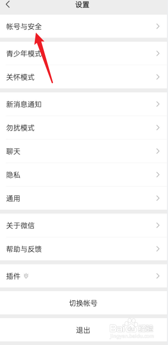 打开微信APP,点击设置下的帐号与安全。