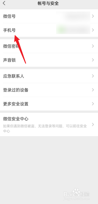 进入帐号与安全界面,点击手机号进去。