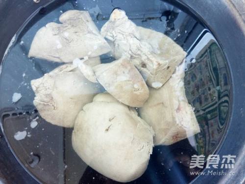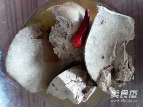10将汤沉淀,把清汤倒入盆里浸泡上猪肝,进行腌制入味。