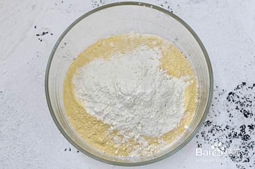 把玉米面和普通面粉一起放入容器中,牛奶用小火煮至稍微沸腾,就是边缘冒泡泡的状态。