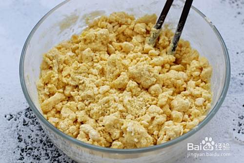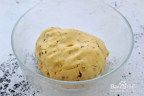 搅拌好的面疙瘩晾置几分钟后加入红枣丁,再揉成粗糙的面团状。