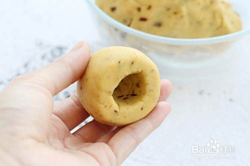 取约70克面团先揉圆,再用拇指按进面团中,一边转动面团一边整理成内部呈中空状。