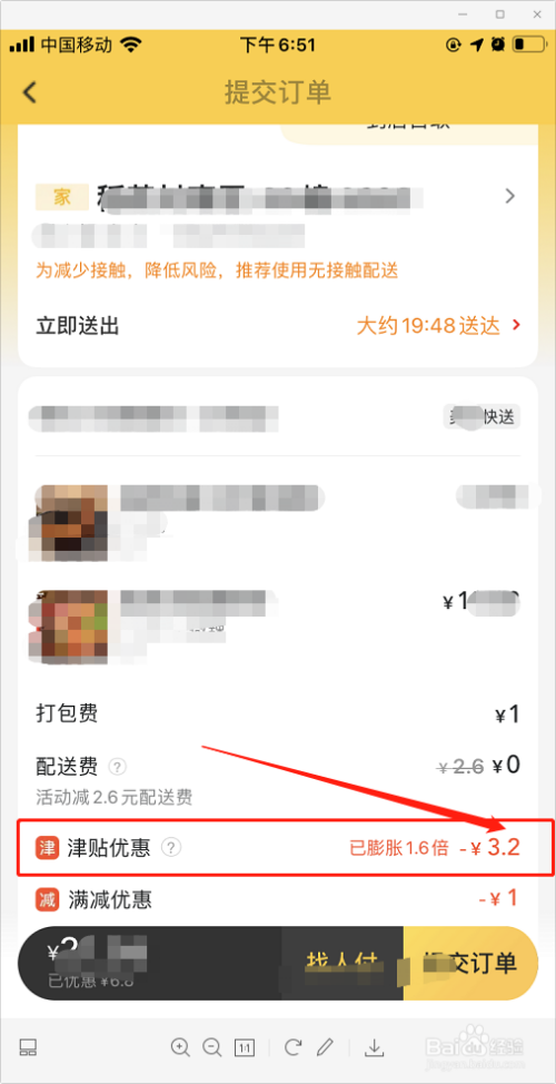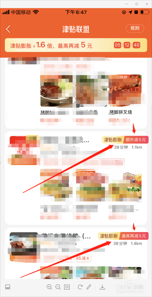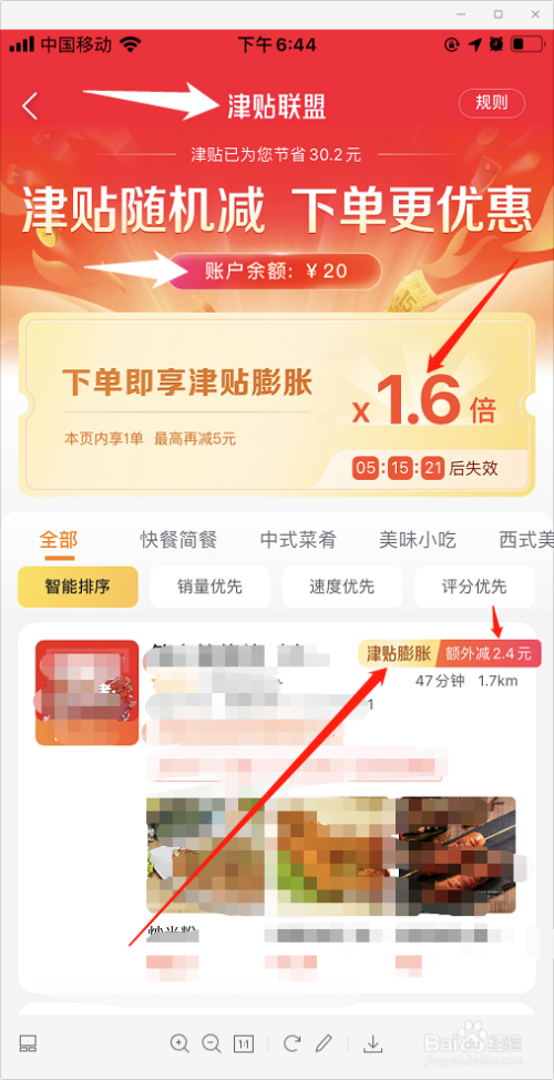 选择有“津贴膨胀”的店铺,直接下单即可。津贴可与满减、折扣优惠、美团红包叠加使用。