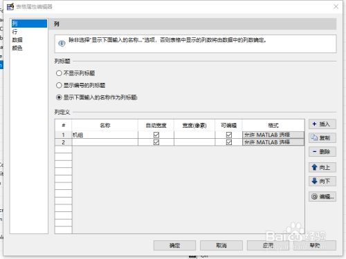 第三步:点击【ColumWidth】右侧的编辑图标后将进入如下图所示的表格属性编辑器界面,可以在这里编辑列、行、数据和颜色的属性。
