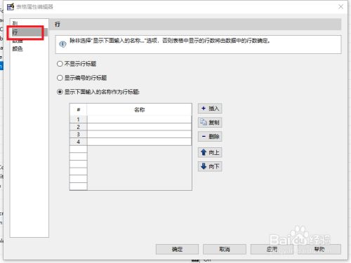 第五步:我们点击【行】,将进入如下图所说的的表格行编辑器界面,我们可以在这里修改行的名称,但不能修改行的高度。