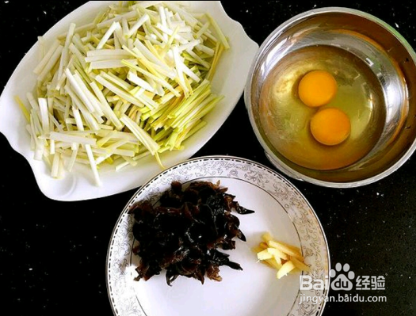 蒜黄切成3厘米左右长的段、鸡蛋加少许盐,木耳提前泡发后洗净切丝,姜切丝
