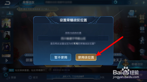 第四步,进入荣耀战区,点击地址最右边的小齿轮,然后它会弹出你现在的位置,问你是否改变荣耀战区位置,你点击使用该位置就行了