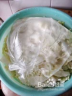 腌制圆白菜可在上面压一个重物,帮助圆白菜吃进盐分,我用的是把一个密封袋装满水系紧封口压在上面,简单易行。