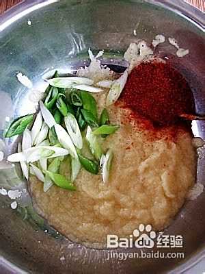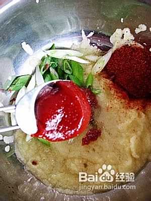 搅打成泥,取一个干净的容器放入辣椒粉,葱段,和搅打好的混合泥。