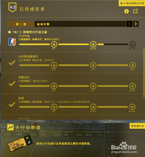 1.购买大行动通行证之后在每周完成相对应的任务,即可获得大行动之星(第1周上限10颗,其余各周上限6颗,总计100颗)