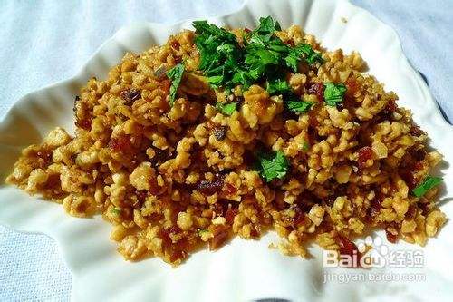 制作:1、嫩豆腐去皮切小块,在开水锅中焯一下,捞出;熟火腿切成细末;鸡里脊肉去筋,剁成茸,放入碗中,用清水(3克)搅散,加入绍酒、精盐(2克)、味精(半克)、干淀粉搅匀;鸡蛋清放入盆内,用筷子用力向一个方向快速搅打成雪白的蛋泡糊,倒入盛鸡茸的碗里搅拌均匀成鸡茸糊。2、炒锅里放鸡清汤、豆腐,旺火上烧开,加入精盐、味精,烧到豆腐入味,用漏勺捞出,放入碗里;原锅汤汁再煮开,用湿淀粉勾成薄芡,慢慢下入鸡肉茸糊,同时不断用勺推拌并加入猪油(以免烧糊),待鸡茸糊熟后,即下豆腐拌和,出锅装盆,撒上火腿末即可。