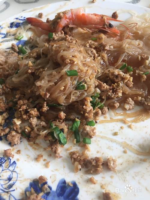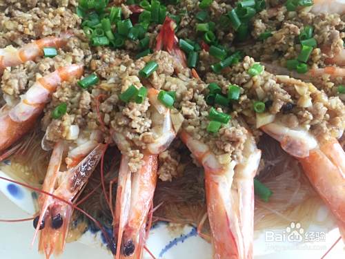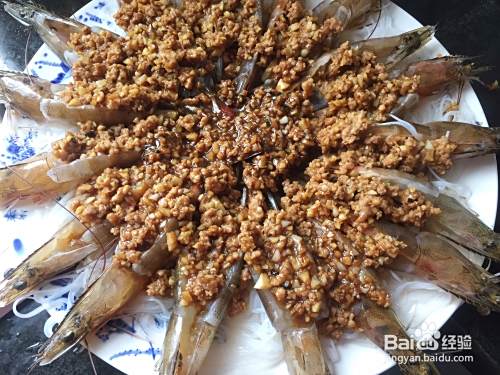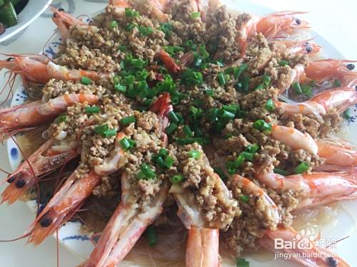 打开虾背,把瘦肉、大蒜和葱一起切碎。然后启动油锅,先将瘦肉炒熟,再加入蒜、葱。加些蚝油、盐、酱油和酱油。一起炒。然后加水。比原料好。炸好后,将粉丝铺在盘底,再放入大虾,再将炒好的肉末放在每只虾的肉上。