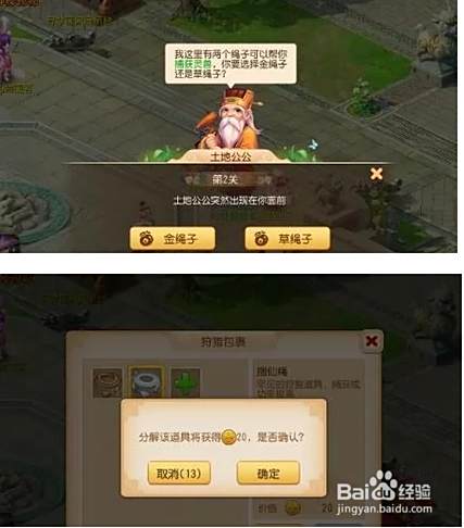 技巧四:博运气选择草绳子 有时候在场景中,我们会遇到特殊事件—土地公公,当询问要金绳子(大概率得乌金绳)还是草绳子(随机得捕兽绳或捆仙绳)时,可以考虑博下运气选择草绳子。从性价比上看,乌金绳分解得10个狩猎币,而捆仙绳得20个,捕兽绳是5个;从作用性看,捆仙绳可捕捉所有灵兽(包括灵兽BOSS),成功率最高。