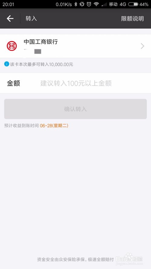 在这个页面可以选择银行卡,然后输入转入金额后点击"确认转入"