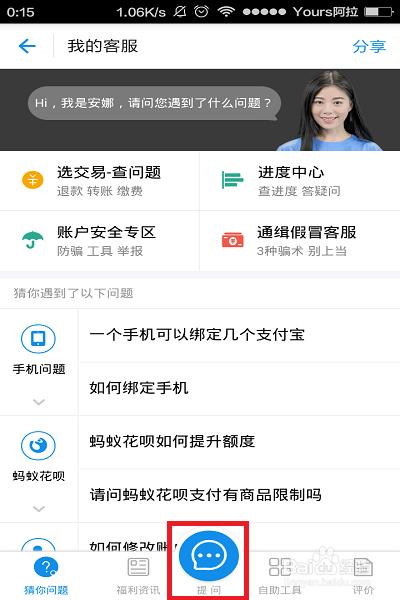 我的客服,点击提问栏。可提问智能机器人,也可回复两次“人工服务”快速进入人工服务