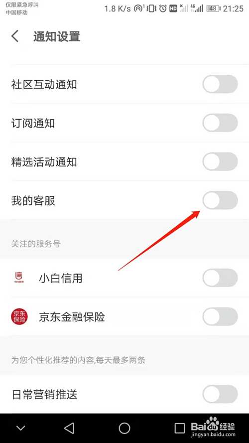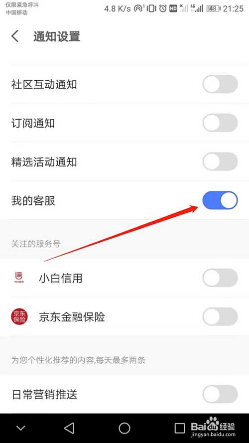 7:“通知设置”页面根据指引点击“我的客服”开关标识。