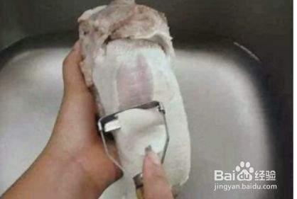 将猪舌头捞出来放冷水里稍微过一下,用刨刀刨去猪舌头上的白色舌苔。