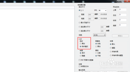 接下来设置“输出色彩”,一共分为两种,一种是黑白色的,另一种则是彩色的,根据自己的需要在“CAD”下设置。