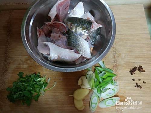 将梭鱼处理干净后斜切成段,香菜和葱切段,大蒜拍扁,姜切片,花椒和八角也准备好;
