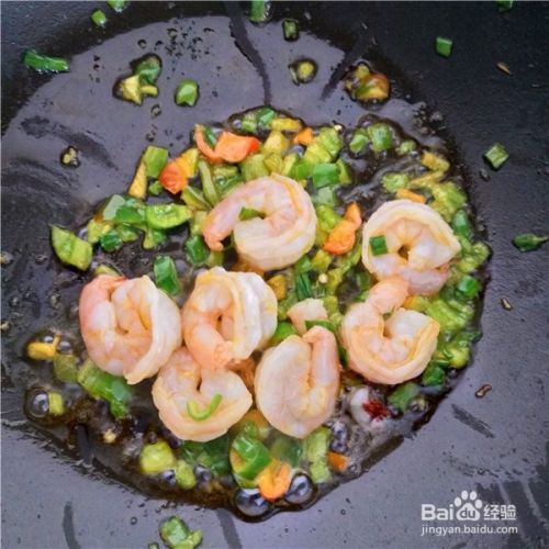 倒入腌好的虾仁翻炒,炒到虾仁发白发微红。