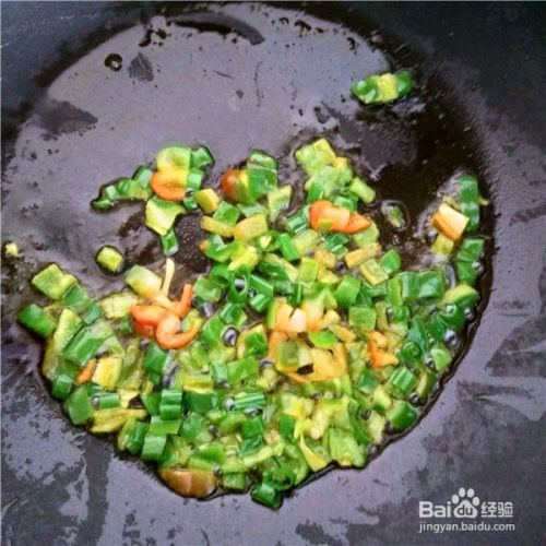 锅中倒入适量的花生油,加入葱花煸香,再加入小米椒翻炒。