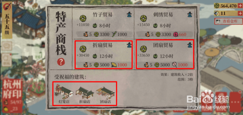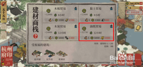 【建材商栈】四周摆放两个4级家具铺,两个4级瓦片店,两个4级花窗店。建议做【油纸贸易】收益最大化。
