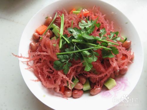 龙须菜洗干净用水浸泡一晚(我用的是煮花生的水,所以龙须菜被浸泡成了红色)