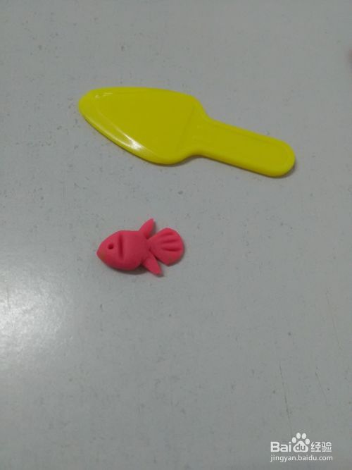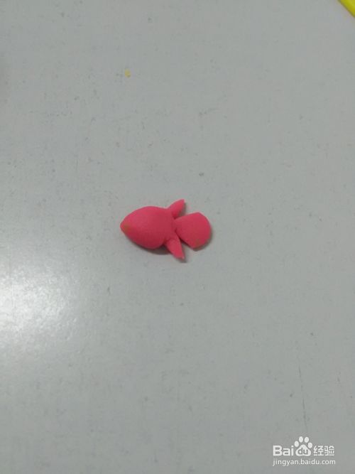 用粉色捏一条小鱼,上下各捏一个尖,当作鱼鳍。
