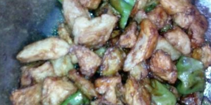 锅里留少许油,放入蒜片炝锅,加入辣椒翻炒,这个时候加盐,生抽,花椒面,白糖,味精。放入炸好的茄子块翻炒一分钟,立即出锅装盘。