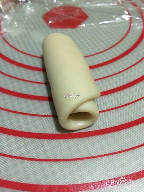 8. 取1份二次擀卷松弛后的面皮,接口处向上,然后对角向内收,整成圆形