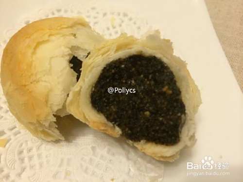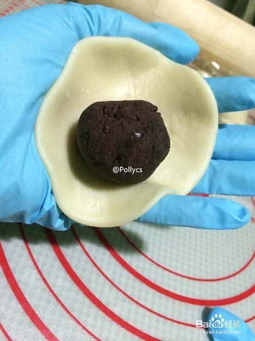 9. 将面团擀开翻面后包入玫瑰黑芝麻馅,收好口