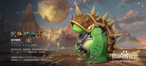 四技能跃空撼地:跃向目标区域,猛然砸落,对区域内敌人造成100魔法伤害并触发4秒余震。