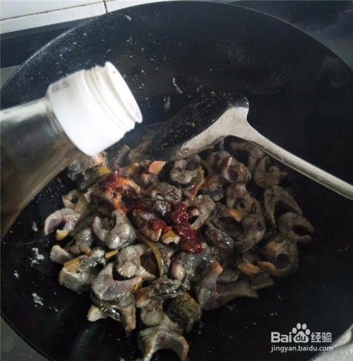 待鳝鱼炒变色后,放入姜、蒜、豆瓣酱翻炒均匀后,再放盐,倒入酱油、醋增添味道。