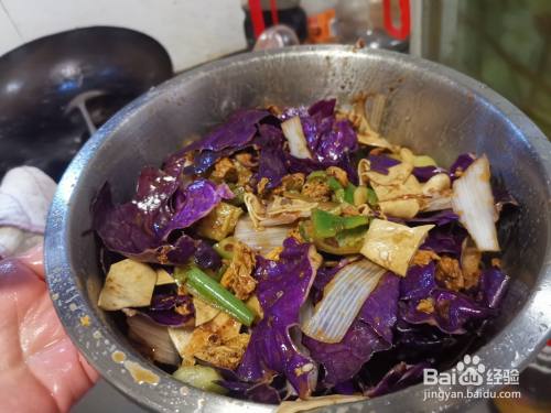 紫甘蓝洗净后,用手撕成块,放入准备拌料的盆中待用