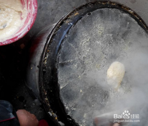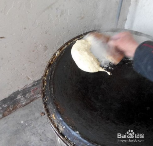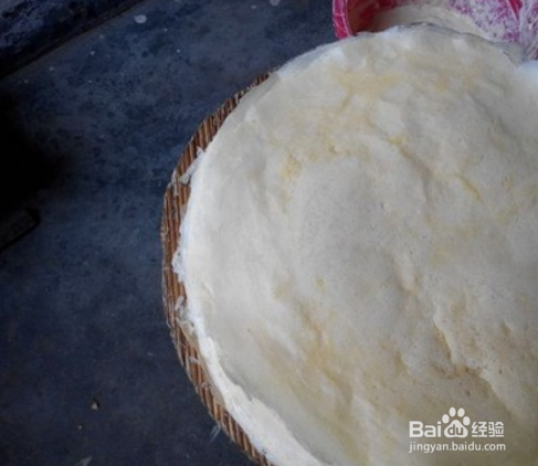 从鏊子中间划圆慢慢推向四周很快“鏊子”上就遍匀了薄薄一层面糊。