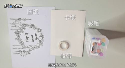1准备好图纸、卡纸、彩笔和胶带。