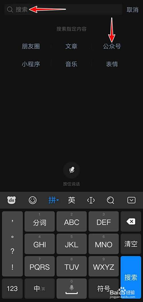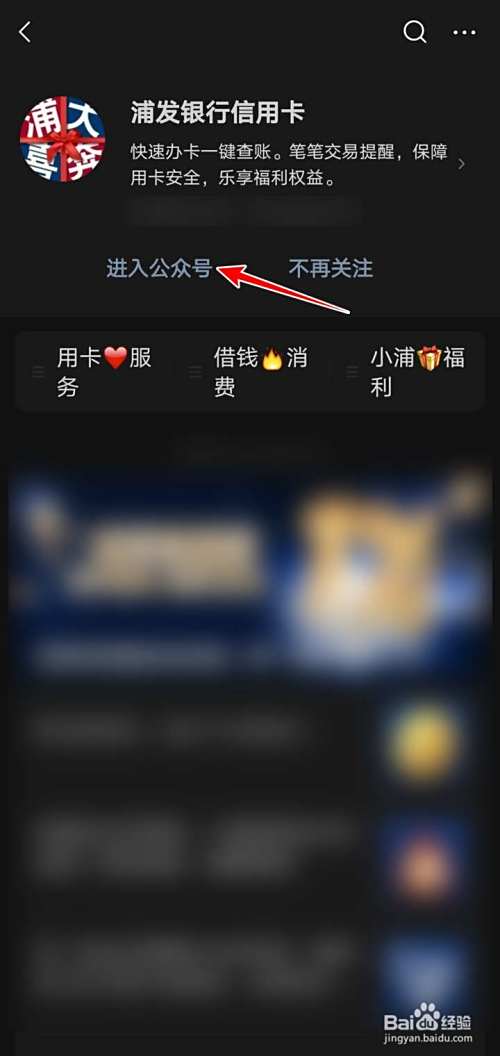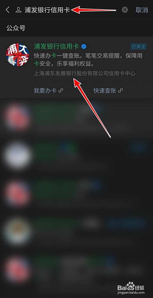 打开微信,点选微信页搜索框中,再点选公众号,输入浦发银行信用卡,点选搜索结果第一项;