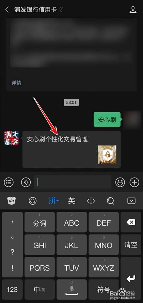 在消息输入框中输入安心刷,点选发送,会收到一个安心刷个性化交易管理入口,点选进入;