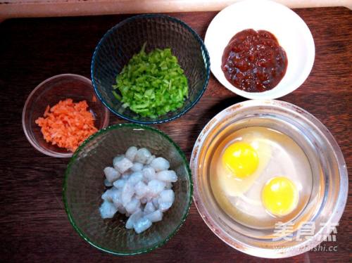 准备食材:青椒和胡萝卜切成小碎丁,虾仁切成小段