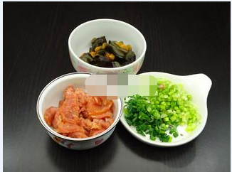 准备食材,瘦肉切薄皮,放油、盐、酱油、淀粉拌均,皮蛋切块,香葱切碎;