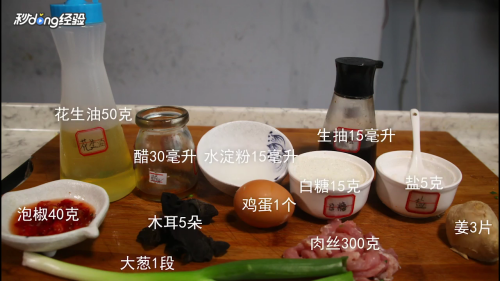 1准备食材:花生油50克、泡椒40克、醋30毫升、木耳5朵、水淀粉15毫升、鸡蛋1个、白糖15克、生抽15毫升、肉丝300克、盐5克、姜3片、大葱1段。