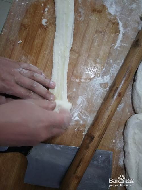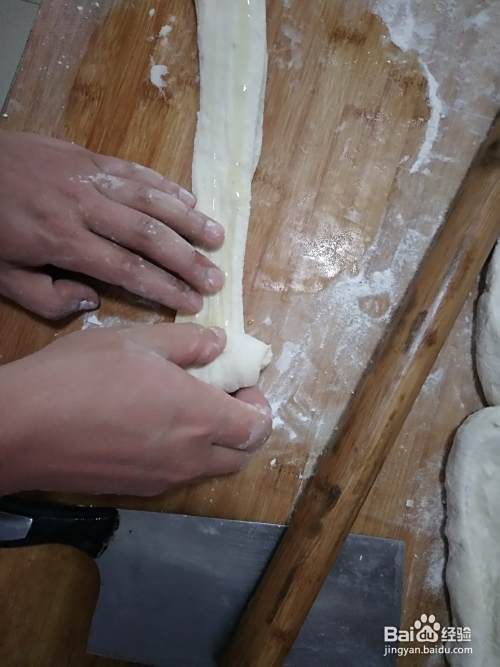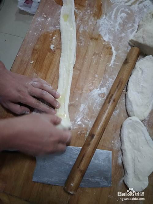在细长面饼上刷上油,开始从一侧往另一侧卷起