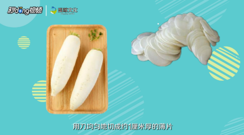 3将白萝卜全部削干净以后,用刀均匀的切成约一厘米厚的薄片,注意切时左手将萝卜按紧在菜板上,防止打滑切手,然后再切成条。