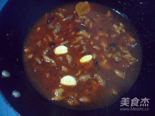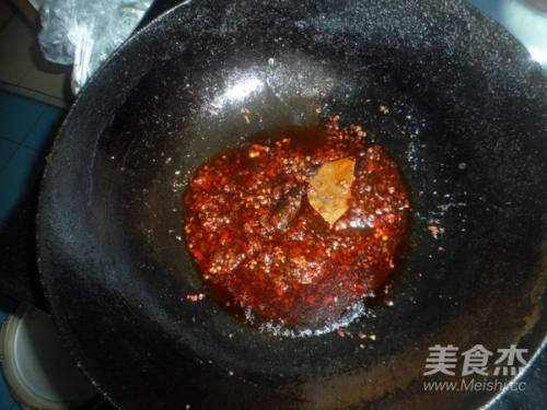 热锅倒油放入豆瓣酱、八角、三奈、香叶、花椒、蒜、冰糖炒香